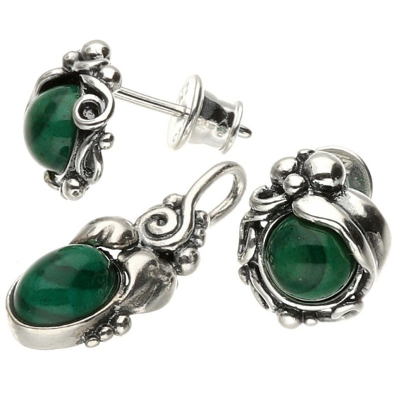 Przepiękny i wyjątkowy komplet, wykonany z oksydowanego srebra próby 925, wysadzany malachitem.
